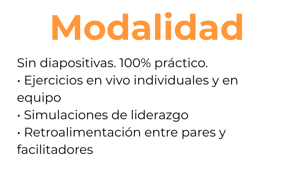 Este enfoque permite un cambio conductual profundo, manteniéndose altamente práctico, escalable y fácil de implementar en múltiples países y poblaciones de liderazgo.